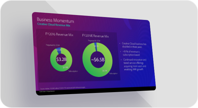 Business Momentum Creative Cloud Revenue Mix FY2016 Revenue Mix FY2019E Revenue Mix Perpetual & OEM • Creative Cloud business has Perpetual & OEM $0.2B doubled in three years $0.2B • ~97% of revenue is subscription-based $3.2B ~$6.5B • Continued innovation and tiered service offerings $2.9B acquiring more users and Subscription $6.3B enabling ARR growth Subscription Source: Adobe; FY2019E reflects FY2019 YTD results and Q4FY19 financial targets © 2019 Adobe. All Rights Reserved.