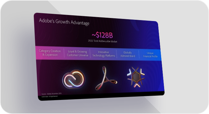 Adobe’s Growth Advantage 2022 Total Addressable Market Category Creation Loyal & Growing Innovative Globally Unique & Expansion Customer Universe Technology Platforms Admired Brand Financial Profile Source: Adobe, November 2019 © 2019 Adobe. All Rights Reserved.