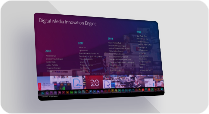 Digital Media Innovation Engine 2019 Scan Magic Clean 2018 Photoshop on iPad Photoshop Camera 2017 Adobe Premiere Rush Fresco on iPad & Surface Adobe XD with Voice triggers Co-editing in XD Adobe XD Adobe XD integration with Ae and Ai CC Desktop app 2016 Lightroom CC Adobe Live on Behance Acrobat Web Essential Graphics Panel in Ae Motion Graphic Templates Adobe Sensei New Search for Stock in Photoshop Adobe Stock Premium Content Design Systems Creative Cloud Libraries Video Collaboration Illustrator with new Properties Panel Collaboration Adobe Stock Mixamo Photoshop Content Aware Fill reimagined PDF Services Online Adobe Portfolio Photoshop Express Adobe Dimension Substance Character Animator Adobe Spark Adobe Fonts Aero CC Learn Adobe Scan Lightroom Search InDesign Asset Link © 2019 Adobe. All Rights Reserved.