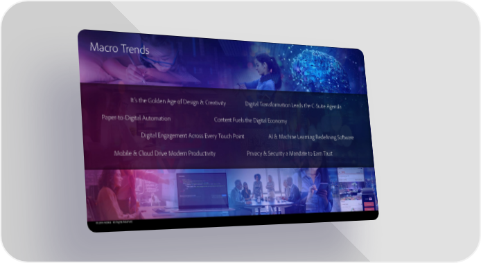 Macro Trends It’s the Golden Age of Design & Creativity Digital Transformation Leads the C-Suite Agenda Paper-to-Digital Automation Content Fuels the Digital Economy Digital Engagement Across Every Touch Point AI & Machine Learning Redefining Software Mobile & Cloud Drive Modern Productivity Privacy & Security a Mandate to Earn Trust © 2019 Adobe. All Rights Reserved.