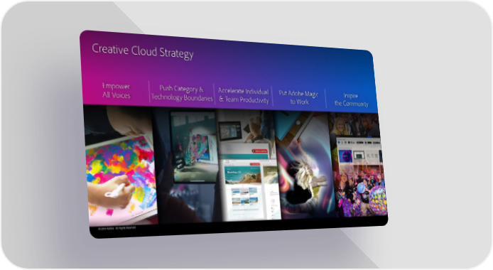 Creative Cloud Strategy Empower Push Category & Accelerate Individual Put Adobe Magic Inspire All Voices Technology Boundaries & Team Productivity to Work the Community © 2019 Adobe. All Rights Reserved.
