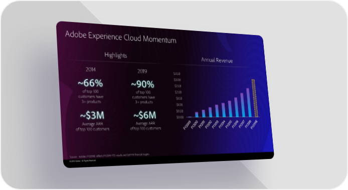 Adobe Experience Cloud Momentum Highlights Annual Revenue 2014 2019 $3.5B $3.0B ~66% ~90% $2.5B of top 100 of top 100 $2.0B customers have customers have $1.5B 3+ products 3+ products $1.0B ~$3M ~$6M $0.5B $0.0B Average ARR Average ARR of top 100 customers of top 100 customers Source: Adobe; FY2019E reflects FY2019 YTD results and Q4FY19 financial targets © 2019 Adobe. All Rights Reserved.