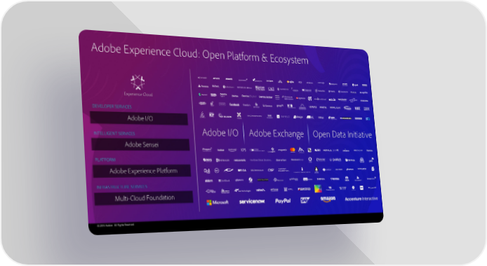 Adobe Experience Cloud: Open Platform & Ecosystem Experience Cloud DEVELOPER SERVICES Adobe I/O INTELLIGENT SERVICES Adobe I/O Adobe Exchange Open Data Initiative Adobe Sensei PLATFORM Adobe Experience Platform INFRASTRUCTURE SERVICES Multi-Cloud Foundation © 2019 Adobe. All Rights Reserved.