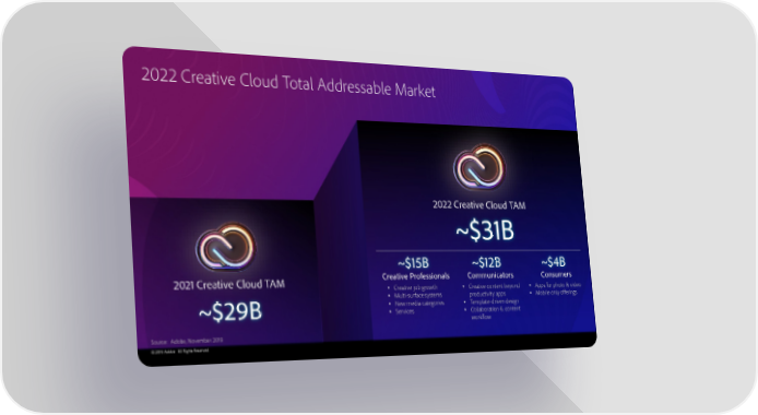 2022 Creative Cloud Total Addressable Market 2022 Creative Cloud TAM ~$31B ~$15B ~$12B ~$4B 2021 Creative Cloud TAM Creative Professionals Communicators Consumers • Creative job growth • Creative content beyond • Apps for photo & video • Multi-surface systems productivity apps • Mobile only offerings • New media categories • Template-driven design ~$29B • Services • Collaboration & content workflow Source: Adobe, November 2019 © 2019 Adobe. All Rights Reserved.