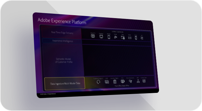 Adobe Experience Platform Unified Experiences Video/TV Desktop Mobile Social Web Email Kiosk IoT Customer Support CRM Inventory Mgmt. POS Store Operations ERP Custom Apps Data Ingestion/Multi-Modal Data Front Office | Back Office © 2019 Adobe. All Rights Reserved.