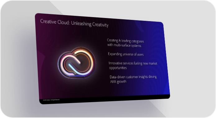 Creative Cloud: Unleashing Creativity Creating & leading categories with multi-surface systems Expanding universe of users Innovative services fueling new market opportunities Data-driven customer insights driving ARR growth © 2019 Adobe. All Rights Reserved.