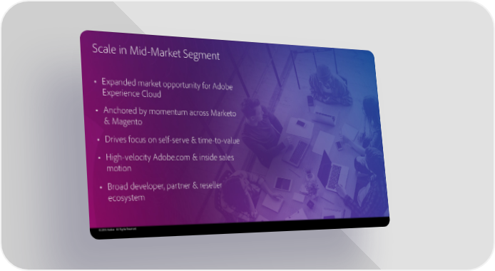 Scale in Mid-Market Segment • Expanded market opportunity for Adobe Experience Cloud • Anchored by momentum across Marketo & Magento • Drives focus on self-serve & time-to-value • High-velocity Adobe.com & inside sales motion • Broad developer, partner & reseller ecosystem © 2019 Adobe. All Rights Reserved.