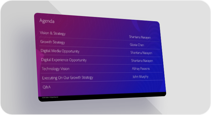 Agenda Vision & Strategy Shantanu Narayen Growth Strategy Gloria Chen Digital Media Opportunity Shantanu Narayen Digital Experience Opportunity Shantanu Narayen Technology Vision Abhay Parasnis Executing On Our Growth Strategy John Murphy Q&A © 2019 Adobe. All Rights Reserved.