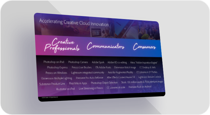 Accelerating Creative Cloud Innovation Photoshop on iPad · Photoshop Camera · Adobe Spark · Adobe XD co-editing · Alexa “Adobe Inspiration Engine” Photoshop Express · Fresco Live Brushes · 17k Adobe Fonts · Dimension Match Image · CC Desktop & Web Fresco on Windows · Lightroom integrated community · Aero for Augmented Reality · CC Libraries in 3rd Parties Dimension Multiple Lighting · Premiere Pro Auto Reframe · After Effects Content Aware Fill · Lightroom Texture Controls Substance Product Line · First Mile in Apps · Photoshop Object Selection · Stock: 130 million assets & 750k premium images Illustrator on iPad · Live Streaming in Fresco · CC Libraries at scale · Premiere Rush on Android © 2019 Adobe. All Rights Reserved.