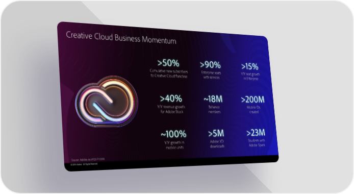 Creative Cloud Business Momentum >50% >90% >15% Cumulative new subscribers Enterprise seats Y/Y seat growth to Creative Cloud franchise with services in Enterprise >40% ~18M >200M Y/Y revenue growth Behance Mobile IDs for Adobe Stock members created ~100% >5M >23M Y/Y growth in Adobe XD Students with mobile units downloads Adobe Spark Source: Adobe, as of Q3 FY2019 © 2019 Adobe. All Rights Reserved.