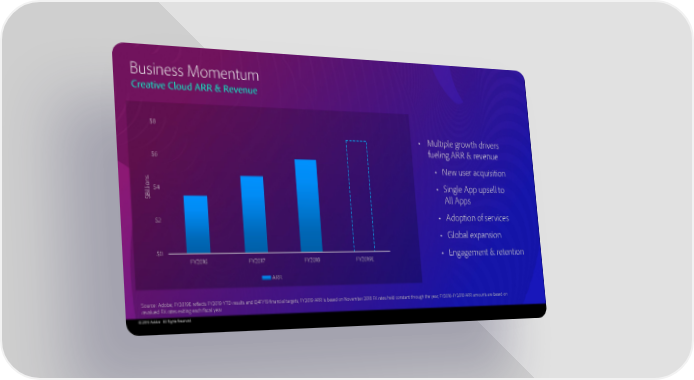 Business Momentum Creative Cloud ARR & Revenue $8 • Multiple growth drivers fueling ARR & revenue $6 • New user acquisition s n o$4 • Single App upsell to lli i B $ All Apps $2 • Adoption of services • Global expansion $0 • Engagement & retention FY2016 FY2017 FY2018 FY2019E ARR Source: Adobe; FY2019E reflects FY2019 YTD results and Q4FY19 financial targets; FY2019 ARR is based on November 2018 FX rates held constant through the year; FY2016-FY2018 ARR amounts are based on revalued FX rates exiting each fiscal year © 2019 Adobe. All Rights Reserved.