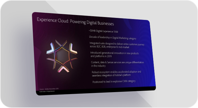 Experience Cloud: Powering Digital Businesses ~$84B Digital Experience TAM Decade of leadership in Digital Marketing category Integrated suite designed to deliver entire customer journey across B2C, B2B, enterprise & mid-market Introduced generational innovation in new products and platforms in 2019 Content, data & Sensei services are unique differentiators in the industry Robust ecosystem enables accelerated adoption and seamless integration of Adobe’s platform Positioned to lead in explosive CXM category Source: Adobe, November 2019 © 2019 Adobe. All Rights Reserved.