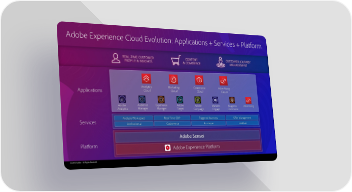 Adobe Experience Cloud Evolution: Applications + Services + Platform REAL-TIME CUSTOMER CONTENT CUSTOMER JOURNEY PROFILE & INSIGHTS & COMMERCE MANAGEMENT Analytics Marketing Commerce Advertising Applications Cloud Cloud Cloud Cloud Adobe Audience Experience Adobe Adobe Marketo Magento Advertising Analytics Manager Manager Target Campaign Engage Commerce Services Analysis Workspace Real-Time CDP Triggered Journeys Offer Management Attribution.ai Customer.ai Journey.ai Leads.ai Adobe Sensei Platform Adobe Experience Platform © 2019 Adobe. All Rights Reserved.