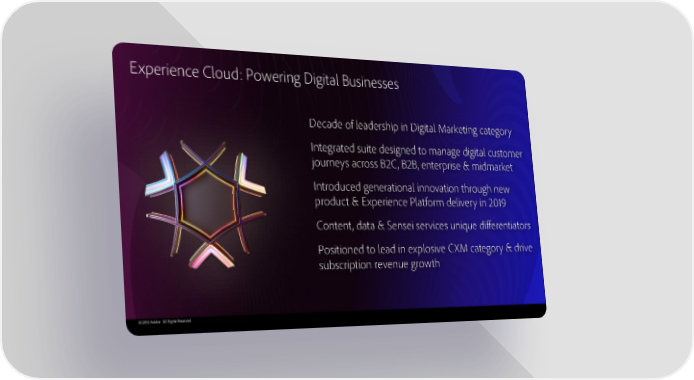 Experience Cloud: Powering Digital Businesses Decade of leadership in Digital Marketing category Integrated suite designed to manage digital customer journeys across B2C, B2B, enterprise & midmarket Introduced generational innovation through new product & Experience Platform delivery in 2019 Content, data & Sensei services unique differentiators Positioned to lead in explosive CXM category & drive subscription revenue growth © 2019 Adobe. All Rights Reserved.