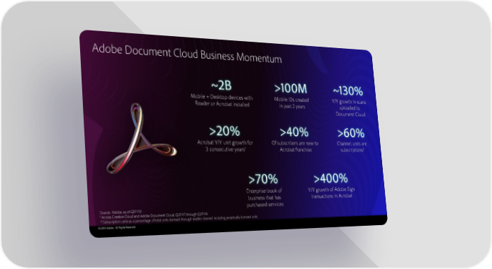 Adobe Document Cloud Business Momentum ~2B >100M ~130% Mobile + Desktop devices with Mobile IDs created Y/Y growth in scans Reader or Acrobat installed in past 2 years uploaded to Document Cloud >20% >40% >60% Acrobat Y/Y unit growth for Of subscribers are new to Channel units are 1 Acrobat franchise subscriptions2 3consecutive years >70% >400% Enterprise book of Y/Y growth of Adobe Sign business that has transactions in Acrobat Source: Adobe, as of Q3FY19 purchased services 1 Across Creative Cloud and Adobe Document Cloud, Q2FY17 through Q3FY19 2 Subscription units as a percentage of total units licensed through reseller channel including perpetually licensed units © 2019 Adobe. All Rights Reserved.