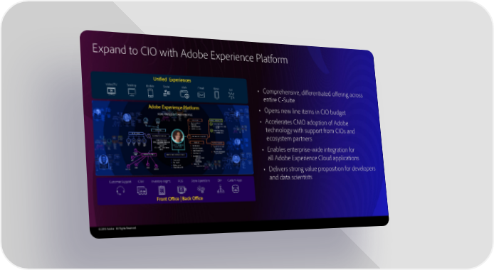Expand to CIO with Adobe Experience Platform • Comprehensive, differentiated offering across entire C-Suite • Opens new line items in CIO budget • Accelerates CMO adoption of Adobe technology with support from CIOs and ecosystem partners • Enables enterprise-wide integration for all Adobe Experience Cloud applications • Delivers strong value proposition for developers and data scientists © 2019 Adobe. All Rights Reserved.