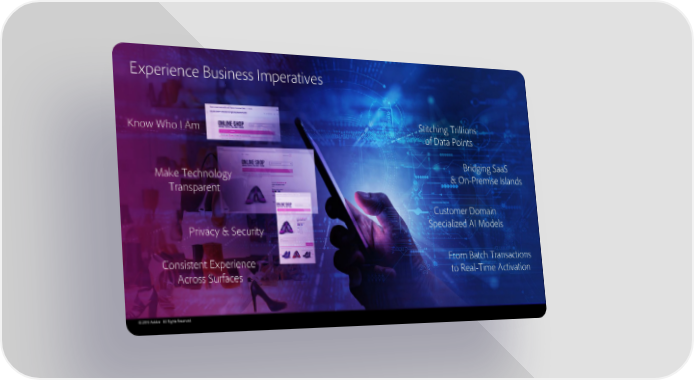 Experience Business Imperatives Know Who I Am Stitching Trillions of Data Points Bridging SaaS Make Technology & On-Premise Islands Transparent Customer Domain Privacy & Security Specialized AI Models Consistent Experience From Batch Transactions Across Surfaces to Real-Time Activation © 2019 Adobe. All Rights Reserved.