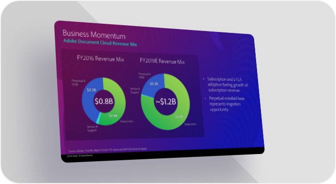 Business Momentum Adobe Document Cloud Revenue Mix FY2016 Revenue Mix FY2019E Revenue Mix Perpetual & OEM • Subscription and ETLA Perpetual & $0.2B adoption fueling growth of OEM $0.3B Service & subscription revenue Support $0.8B ~$1.2B • Perpetual installed base represents migration opportunity $0.4B $1.0B Subscription Service & Subscription Support Source: Adobe; FY2019E reflects FY2019 YTD results and Q4FY2019 financial targets © 2019 Adobe. All Rights Reserved.