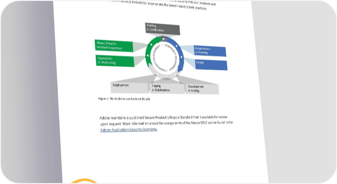 The Adobe Secure Product Lifecycle Integrated into several stages of the product lifecycle—from design and development to quality assurance, testing, and deployment— the Adobe Secure Product Lifecycle (SPLC) is the foundation of all security at Adobe. A rigorous set of several hundred specific security activities spanning software development practices, processes, and tools, the Adobe SPLC defines clear, repeatable processes to help our development teams build security into our products and services and continuously evolves to incorporate the latest industry best practices. Training & Certification > C O M Abuse, Fraud & T M Requirements N U E N Incident Responses M I & Planning E TY G A EN G Operations NE AG Design YTI EG & Monitoring NU EM MMOC TN > Deployment Staging Development & Stabilization & Testing Figure 5: The Adobe Secure Product Lifecycle Adobe maintains a published Secure Product Lifecycle Standard that is available for review upon request. More information about the components of the Adobe SPLC can be found in the Adobe Application Security Overview. 11