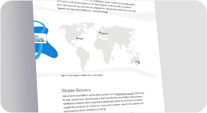 Adobe Experience Platform Hosting and Security Data Center Locations The Adobe Experience Platform service infrastructure resides in enterprise-class data centers from public cloud service providers in U.S. East (Virginia), Amsterdam (NL), and Sydney (AU). Upon provisioning, customers can designate the regional data center(s) where the data ingested into Experience Platform will be sent for storage. Amsterdam Virginia Sydney Figure 2: Adobe Experience Platform Data Center Locations Disaster Recovery Adobe Experience Platform uptime data is available on the Adobe Status website. Additionally, for both planned and unplanned system downtime, the Experience Platform team follows a notification process to inform customers about the status of the service. If there is a need to migrate the operational service from a primary site to a disaster recovery site, customers will receive several specific notifications including: • Notification of the intent to migrate the services to the disaster recovery site • Hourly progress updates during the service migration • Notification of completion of the migration to the disaster recovery site 8