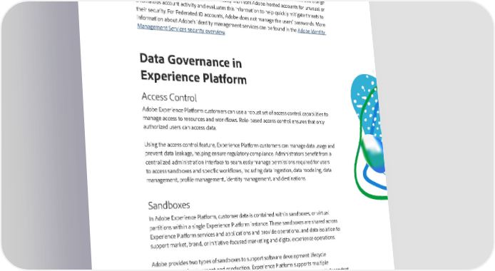 Federated ID is an enterprise-managed account where all identity profiles—as well as all associated assets—are provided by the customer’s Single Sign-On (SSO) identity management system and are created, owned, controlled by the customers’ IT infrastructure. Adobe integrates with most SAML2.0 compliant identity providers. Adobe IDs and Enterprise IDs both leverage the SHA-256 hash algorithm in combination with password salts and a large number of hash iterations. Adobe continually monitors Adobe-hosted accounts for unusual or anomalous account activity and evaluates this information to help quickly mitigate threats to their security. For Federated ID accounts, Adobe does not manage the users’ passwords. More information about Adobe’s identity management services can be found in the Adobe Identity Management Services security overview. Data Governance in Experience Platform Access Control Adobe Experience Platform customers can use a robust set of access control capabilities to manage access to resources and workflows. Role-based access control ensures that only authorized users can access data. Using the access control feature, Experience Platform customers can manage data usage and prevent data leakage, helping ensure regulatory compliance. Administrators benefit from a centralized administration interface to seamlessly manage permissions required for users to access sandboxes and specific workflows, including data ingestion, data modeling, data management, profile management, identity management, and destinations. Sandboxes In Adobe Experience Platform, customer data is contained within sandboxes, or virtual partitions within a single Experience Platform instance. These sandboxes are shared across Experience Platform services and applications and provide operational and data isolation to support market, brand, or initiative-focused marketing and digital experience operations. Adobe provides two types of sandboxes to support software development lifecycle requirements: development and production. Experience Platform supports multiple production and development sandboxes, with each sandbox maintaining its own independent library of Experience Platform resources, including schemas, datasets, and profiles. Content and actions taken within any given sandbox are confined only to that sandbox and do not affect any other sandboxes. For more information about Adobe Experience Platform data governance, please see the Adobe Experience Platform Data Governance white paper. 7
