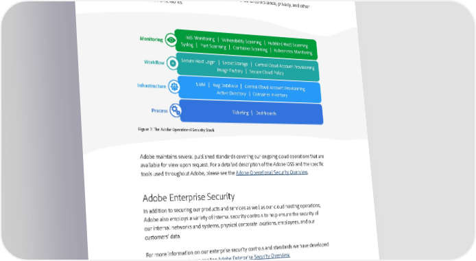 Adobe Operational Security To help ensure that all Adobe products and services are designed from inception with security best practices in mind, the operational security team created the Adobe Operational Security Stack (OSS). The OSS is a consolidated set of tools that help product developers and engineers improve their security posture and reduce risk to both Adobe and our customers while also helping drive Adobe-wide adherence to compliance, privacy, and other governance frameworks. Monitoring IaaS Monitoring | Vulnerability Scanning | Hubble (Host) Scanning Syslog | Port Scanning | Container Scanning | Kubernetes Monitoring Workflow Secure Host Login | Secret Storage | Central Cloud Account Provisioning Image Factory | Secure Cloud Policy Infrastructure SIEM | Bug Database | Central Cloud Account Provisioning Active Directory | Container Inventory Process Ticketing | Dashboards Figure 7: The Adobe Operational Security Stack Adobe maintains several published standards covering our ongoing cloud operations that are available for view upon request. For a detailed description of the Adobe OSS and the specific tools used throughout Adobe, please see the Adobe Operational Security Overview. Adobe Enterprise Security In addition to securing our products and services as well as our cloud hosting operations, Adobe also employs a variety of internal security controls to help ensure the security of our internal networks and systems, physical corporate locations, employees, and our customers’ data. For more information on our enterprise security controls and standards we have developed for these controls, please see the Adobe Enterprise Security Overview. 13
