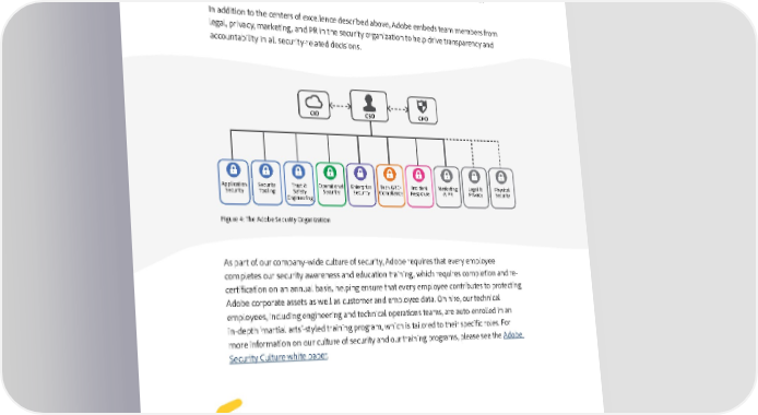 The Adobe Security Organization Based on a platform of transparent, accountable, and informed decision-making, the Adobe security organization brings together the full range of security services under a single governance model. At a senior level, the CSO closely collaborates with the Chief Information Officer (CIO) and Chief Privacy Officer (CPO) to help ensure alignment on security strategy and operations. In addition to the centers of excellence described above, Adobe embeds team members from legal, privacy, marketing, and PR in the security organization to help drive transparency and accountability in all security-related decisions. CIO CSO CPO Application Security Trust & Operational Enterprise Tech GRC/ Incident Marketing Legal & Physical Security Tooling Safety Security Security Compliance Response & PR Privacy Security Engineering Figure 4: The Adobe Security Organization As part of our company-wide culture of security, Adobe requires that every employee completes our security awareness and education training, which requires completion and re- certification on an annual basis, helping ensure that every employee contributes to protecting Adobe corporate assets as well as customer and employee data. On hire, our technical employees, including engineering and technical operations teams, are auto-enrolled in an in-depth ‘martial arts’-styled training program, which is tailored to their specific roles. For more information on our culture of security and our training programs, please see the Adobe Security Culture white paper. 10