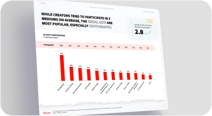 ADOBE CREATORS IN THE CREATOR ECONOMY DETAILED FINDINGS WHILE CREATORS TEND TO PARTICIPATE IN 3 MEDIUMS ON AVERAGE, THE VISUAL ARTS ARE Average number of activites MOST POPULAR, ESPECIALLY PHOTOGRAPHY. that creators participate in 2.8 ACTIVITY PARTICIPATION % selecting response Photography 100% 63% 65% 70% 62% 57% 62% 57% 55% 57% 56% 54% 54% 30% 27% 25% 21% 18% 18% 17% 16% 16% 12% 11% y g g gn g/ s gn ts Ts ritin tion in si kin tc si tion tion/ v as NF graph stra or , e ience ea ea odc to ve w u w g per g de ho ti ilmmak od kin x hion de sic cr te cr g p P ea g/ill F raphic de o or as u si amin tin Cr in G W w F M eb g ea aint tal Cr P me VR or AR e pp/w A S17. Through which, if any, of the following activities have you personally created products, works, materials, etc., in the past 12 months? Base: Creators (n=4535) 26