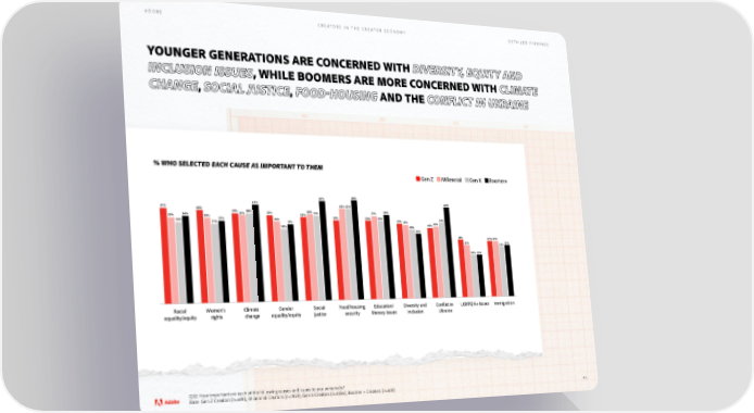 ADOBE CREATORS IN THE CREATOR ECONOMY DETAILED FINDINGS YOUNGER GENERATIONS ARE CONCERNED WITH DIVERSITY, EQUITY AND INCLUSION ISSUES, WHILE BOOMERS ARE MORE CONCERNED WITH CLIMATE CHANGE, SOCIAL JUSTICE, FOOD-HOUSING AND THE CONFLICT IN UKRAINE % WHO SELECTED EACH CAUSE AS IMPORTANT TO THEM Gen Z Millennial Gen X Boomer+ 67% 68% 64% 64% 61% 60% 62% 62% 58% 57% 58% 57% 58% 57% 57% 58% 55% 56% 55% 56% 52% 53% 53% 54% 54% 54% 53% 51% 51% 52% 51% 50% 48% 48% 49% 45% 41% 40 40% 37% 36% 37% 30% 30% Racial Women’s Climate Gender Social Food/housing Education/ Diversity and Conict in LGBTQIA+ issues Immigration equality/equity rights change equality/equity justice security literacy issues inclusion Ukraine Q32: How important are each of the following causes and issues to you personally? Base: Gen Z Creators (n=619), Millennial Creators (n=1929), Gen X Creators (n=1356), Boomer + Creators (n=631) 46