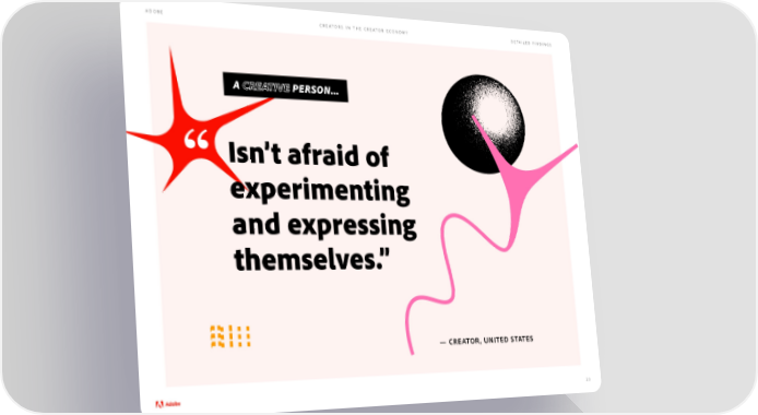 Adobe - Future of Creativity Study Page 22 Page 24ADOBE CREATORS IN THE CREATOR ECONOMY DETAILED FINDINGS A CREATIVE PERSON... “ Isn’t afraid of experimenting and expressing themselves.” — CREATOR, UNITED STATES 23