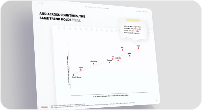 ADOBE CREATORS IN THE CREATOR ECONOMY DETAILED FINDINGS AND ACROSS COUNTRIES, THE SAME TREND HOLDS TRUE. Countries with a higher share of creators who post weekly tend to also have a higher share of positive Creators. Brazil US Spain UK Australia Germany France Japan South Korea % of Creators Who Post Content At Least Weekly % of Creators Who Consider eir Overall Mood to Be Currently Positive Q26: Generally, how would you describe your current mood overall? 38 Base: Content creators by market US (n=508), UK (n=501), Australia (n=500), France (n=506), Germany (n=500), Japan (n=506), Brazil (n=513), Spain (n=500), South Korea (n=501)