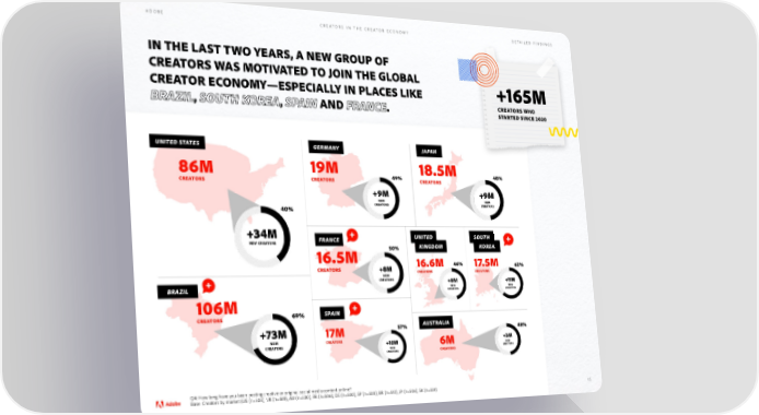 ADOBE CREATORS IN THE CREATOR ECONOMY DETAILED FINDINGS IN THE LAST TWO YEARS, A NEW GROUP OF CREATORS WAS MOTIVATED TO JOIN THE GLOBAL +165M CREATOR ECONOMY—ESPECIALLY IN PLACES LIKE BRAZIL, SOUTH KOREA, SPAIN AND FRANCE. CREATORS WHO STARTED SINCE 2020 UNITED STATES GERMANY JAPAN 86M 19M 18.5M 48% CREATORS 49% CREATORS CREATORS +9M +9M NEW NEW CREATORS CREATORS 40% +34M FRANCE UNITED SOUTH NEW CREATORS KINGDOM KOREA 16.5M 50% CREATORS +8M 16.6M 46% 17.5M 62% CREATORS CREATORS NEW CREATORS +8M +11M BRAZIL NEW NEW CREATORS CREATORS 106M 69% SPAIN CREATORS +73M 17M 57% AUSTRALIA 48% NEW CREATORS +10M +3M CREATORS 6M NEW NEW CREATORS CREATORS CREATORS Q4: How long have you been posting creative or original social media content online? Base: Creators by market (US (n=508), UK (n=501), AU (n=500), FR (n=506), DE (n=500), SP (n=500), BR (n=512), JP (n=506), SK (n=501) 15