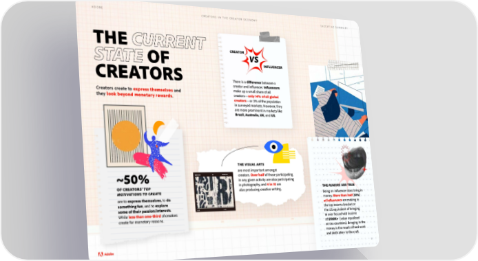 ADOBE CREATORS IN THE CREATOR ECONOMY EXECUTIVE SUMMARY THE CURRENT CREATOR VS STATE OF INFLUENCER CREATORS 吀栀ere is a di昀昀erence between a creator and in昀氀uencer. In昀氀uencers Creators create to express themselves and make up a small share of all they look beyond monetary rewards. creators—only 14% of all global creators—or 3% of the population in surveyed markets. However, they are more prominent in markets like Brazil, Australia, UK, and US. THE VISUAL ARTS are most important amongst creators. Over half of those participating ~50% in any given activity are also participating OF CREATORS’ TOP in photography, and 4 in 10 are THE RUMORS ARE TRUE MOTIVATIONS TO CREATE also producing creative writing. Being an in昀氀uencer does bring in are to express themselves, to do money. More than half (51%) something fun, and to explore of in昀氀uencers are making in some of their passion/interests. the top income bracket or While less than one-third of creators the US equivalent of bringing create for monetary reasons. in over household income of $100K+ (value equalized across countries). Bringing in the money is the result of hard work and dedication to the cra昀琀. 8