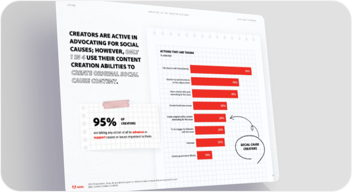 ADOBE CREATORS IN THE CREATOR ECONOMY DETAILED FINDINGS CREATORS ARE ACTIVE IN ADVOCATING FOR SOCIAL CAUSES; HOWEVER, ONLY ACTIONS THEY ARE TAKING % selected 1 IN 4 USE THEIR CONTENT CREATION ABILITIES TO Talk about it with friends/family 56% CREATE ORIGINAL SOCIAL Express my opinions/stance 43% CAUSE CONTENT. on the subject online Share content other post 41% advocating for the cause Donate funds/raise money 30% OF Create original online content 28% advocating for the cause 95% CREATORS are taking any action at all to advance or Try to engage my followers 26% with the cause support causes or issues important to them. Volunteer 25% SOCIAL CAUSE CREATORS Contact government ocials 13% Q33. What actions, if any, do you take to support or advance causes or issues that are important to you? Base: Content Creators (n=4535) 47