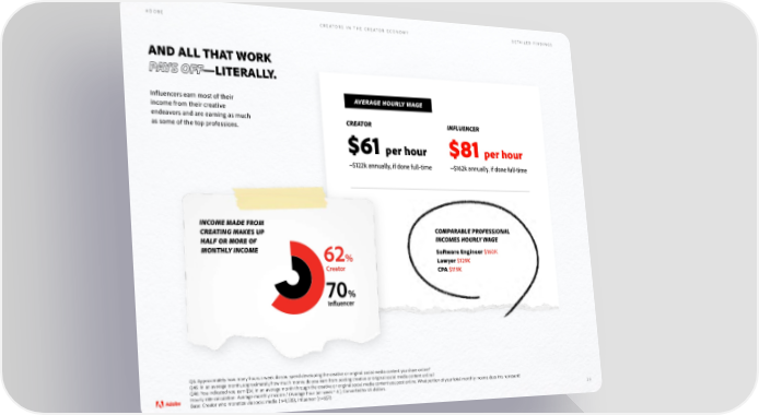 ADOBE CREATORS IN THE CREATOR ECONOMY DETAILED FINDINGS AND ALL THAT WORK PAYS OFF—LITERALLY. Influencers earn most of their AVERAGE HOURLY WAGE income from their creative endeavors and are earning as much CREATOR INFLUENCER as some of the top professions. $61 per hour $81 per hour ~$122k annually, if done full-time ~$162k annually, if done full-time INCOME MADE FROM CREATING MAKES UP COMPARABLE PROFESSIONAL HALF OR MORE OF INCOMES HOURLY WAGE MONTHLY INCOME 62% Software Engineer $160K Lawyer $129K Creator CPA $119K 70% Inuencer Q6. Approximately how many hours a week do you spend developing the creative or original social media content you share online? Q45: In an average month, approximately how much money do you earn from posting creative or original social media content online? Q46: You indicated you earn [$x] in an average month through the creative or original social media content you post online. What portion of your total monthly income does this represent? Hourly rate calculation: Average monthly income / (Average hour per week * 4 ); Converted to US dollars. 29 Base: Creator who monetize via social media (n=1,535), Influencer (n=657)