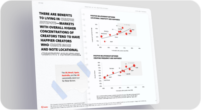 ADOBE CREATORS IN THE CREATOR ECONOMY DETAILED FINDINGS THERE ARE BENEFITS POSITIVE RELATIONSHIP BETWEEN LOCATIONAL CREATIVITY AND HAPPINESS TO LIVING IN CREATOR TOP PERFORMERS HOTSPOTS—MARKETS 55% US WITH OVERALL HIGHER 45% UK Australia Brazil Germany Spain CONCENTRATIONS OF 35% South Korea CREATORS TEND TO HAVE 25% France HAPPIER CREATORS Locational Creativity Average15% Japan WHO CREATE MORE 5% 40% 50% 60% 70% 80% 90% % of creators with a positive mood (T3B) AND NOTE LOCATIONAL CREATIVITY ADVANTAGES. POSITIVE RELATIONSHIP BETWEEN CREATING FREQUENCY AND HAPPINESS 85% US TOP PERFORMERS 80% 75% Germany UK Brazil 70% Spain The US, Brazil, Spain, 65% Australia, and the UK 60% Australia France consistently stand out Weekly Posters55% Japan for these factors. 50% South Korea 45% 40% 40% 50% 60% 70% 80% 90% % of creators with a positive mood (T3B) Note: Locational creativity average is calculated among those who agree (T2B) with the following statements: The area around where I live is a source of inspiration, has a lot of creative energy, is the most creative environment I could imagine living in, inspires my creativity, and creative expression is highly valued. Q26: Generally, how would you describe your current mood overall? Q15. Where do you get inspiration for your creative activities? Q16. When thinking about the area where you live (e.g., your city / town or neighborhood), how much do you agree or disagree with the following 20 statements? Base: Creators by market (US (n=508), UK (n=501), AU (n=500), FR (n=506), DE (n=500), SP (n=500), BR (n=512), JP (n=506), SK (n=501)