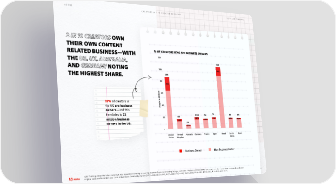 ADOBE CREATORS IN THE CREATOR ECONOMY DETAILED FINDINGS 2 IN 10 CREATORS OWN THEIR OWN CONTENT RELATED BUSINESS—WITH % OF CREATORS WHO ARE BUSINESS OWNERS THE US, UK, AUSTRALIA, 120 15M AND GERMANY NOTING 100 14% THE HIGHEST SHARE. 22M 80 26% 60 26% of creators in the US are business People in Millions 40 owners—and this translates to 22 3.5M 2M 3M 2M 2M 20 4M 19% 15% million business 24% 15% 10% 10% owners in the US . 1M 21% - United United Australia Germany France Japan Brazil South Spain States Kingdom Korea Business Owner Non Business Owner Q13: Thinking about the future, would you be interested in owning or running your own business (including being a contractor / freelancer) that allowed you to sell or make money from the type of creative or original social media content you share online? Base: Creators by market (US (n=508), UK (n=501), AU (n=500), FR (n=506), DE (n=500), SP (n=500), BR (n=512), JP (n=506), SK (n=501) 18