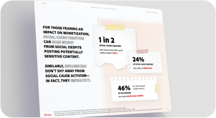 ADOBE CREATORS IN THE CREATOR ECONOMY DETAILED FINDINGS FOR THOSE FEARING AN IMPACT ON MONETIZATION, SOCIAL CAUSE CREATORS 1 in 2 CAN EARN MONEY SOCIAL CAUSE CREATORS FROM SOCIAL DESPITE earn money from their social POSTING POTENTIALLY media content (48%). SENSITIVE CONTENT. 24% SIMILARLY, INFLUENCERS OF SOCIAL CAUSE CREATORS DON’T SHY AWAY FROM also qualify as In昀氀uencers. SOCIAL CAUSE ACTIVISM— IN FACT, THEY EMBRACE IT. (vs. 28% of overall 46% content creators) OF INFLUENCERS social cause content. also create S26. Do you currently earn money through posting social media content? Bases: Content Creators (n=4178), Social Content Posters (n=1206) Q33. What actions, if any, do you take to support or advance causes or issues that are important to you? Bases: Content Creators (n=4535), Influencers (n=657) 50 D1. Approximately how many followers do you currently have on social media? Please consider the platform where you have the most followers. Bases: Content Creators (n=4535), Social Cause Content Creators (n=1251)